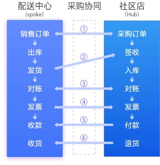 社区店(Hub)通过上平台协同业务,实现业务订单全生命周期管理和数据可视化。同时可以根据上游供应商(spoke)信息化协同意愿进行场景配置